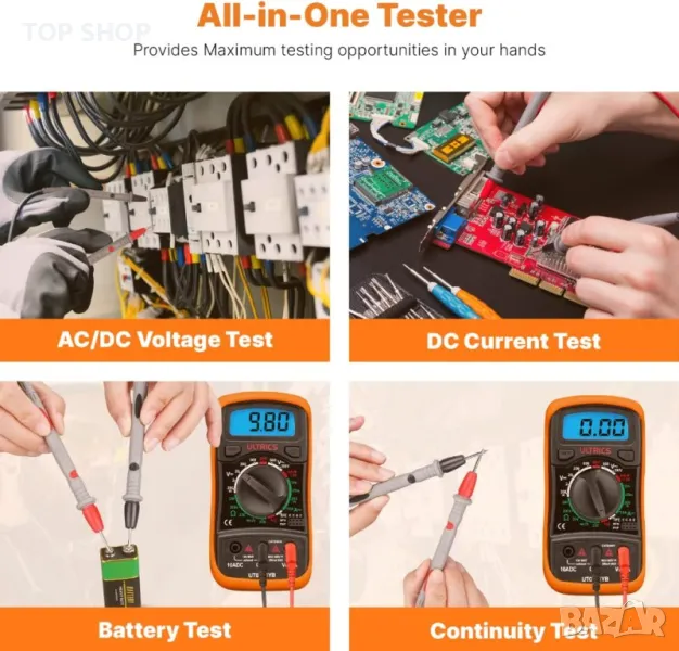 мултицет, Волтметър Амперметър Омметър Проверка на вериги с подсветка LCD тестови проводници, Преносим мултитестер Измерва OHM AC DC Напрежение Ток Съпротивление Непрекъснатост Диоди Транзистор