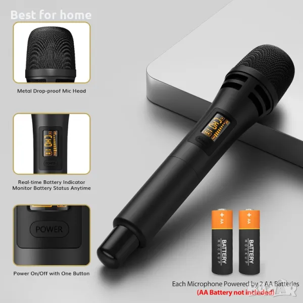 Дълго работно време: Всеки микрофон се захранва от 2 AA батерии, за да се гарантира дългото му работно време (AA батериите НЕ СА ВКЛЮЧЕНИ). Приемникът с вградена презареждаема батерия 1500mAh за 5-6 часа непрекъсната употреба само с 2-3 часа зареждане. Изработен от метална боя и ABS пластмаса, този микрофон е лек за използване в движение. Екранът на дисплея показва батерията и силата на сигнала за оптимална работа.