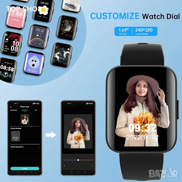 1,69" HD Full Touch Screen: Рамка за часовник с висока текстура с 1,69" LCD full touch цветен екран осигурява удобно докосване и отлично визуално изживяване. Има различни стилове на циферблата, от които да избирате в приложението. Също така можете да изберете снимка, която харесвате, за да персонализирате циферблата в приложението „QWatch Pro“. И екранът на смарт часовника ще светва всеки път, когато вдигнете ръката си.