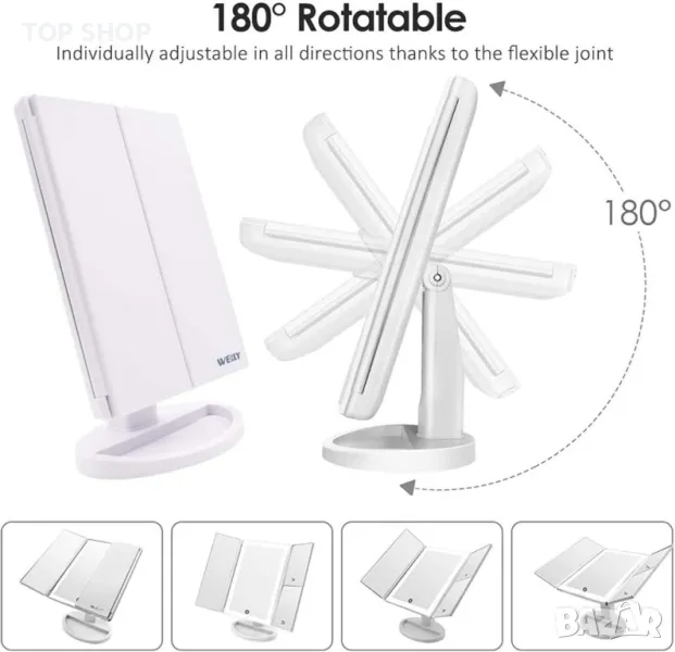 Завъртане на 180 градуса и трикратно сгъване: Стойката за огледало на вашия плот може да се регулира на 180° свободно и да се фиксира, за да осигури перфектен и удобен ъгъл на гледане, удобен за сутрешно бръснене на мъже и гримиране на жени.