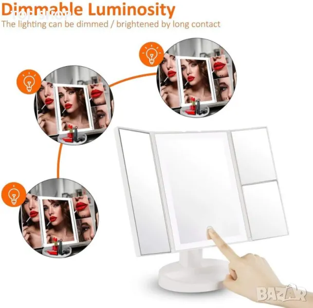 3 режима на увеличение и контрол на сензорния екран: Осветеното козметично огледало е оборудвано с 1X/2X/3X увеличително огледало. Уверете се, че всеки детайл от вашата прическа и грим е обгрижен с удобната функция за мащабиране. С управлението на сензорния екран можете да включвате/изключвате светлината чрез кратко натискане и да регулирате яркостта чрез дълго натискане.