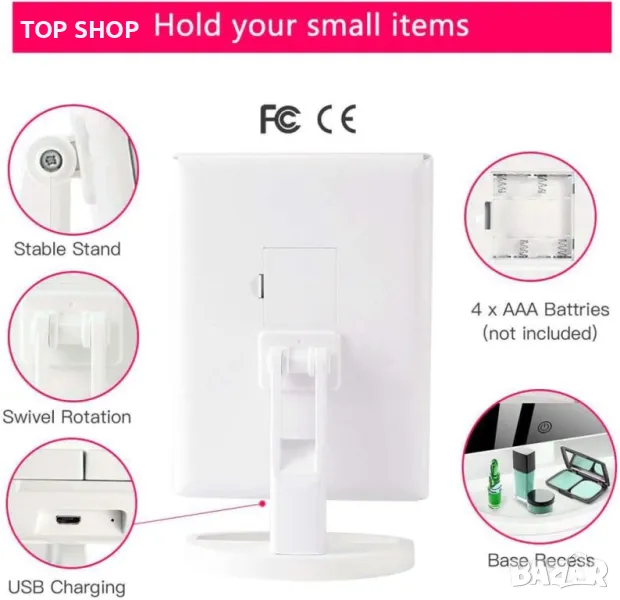 Двойно захранване: 4 броя AAA батерия (не са включени) и микро USB кабел (включен) могат да захранват това огледало с осветление, в допълнение, подвижната му стойка и сгъваемият дизайн ви позволяват да носите светещото козметично огледало навсякъде, когато отидете.