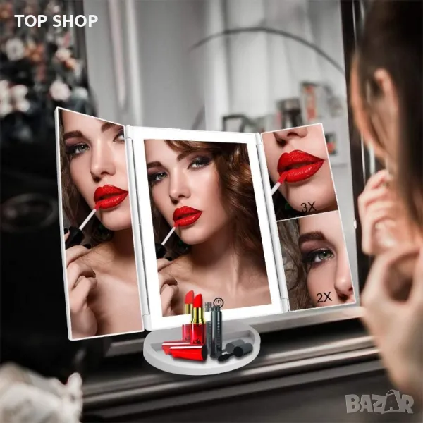 огледало за грим с LED осветление и сензорен екран, трикратно сгъване 1x 2x 3x увеличение, 180° регулируемо завъртане, захранване от батерия и USB, козметично огледало за плот (бяло)