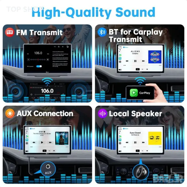 Гъвкави аудио опции: Насладете се на набор от аудио възможности с четири звукови изхода, включително Bluetooth поточно предаване на музика (чрез Carplay или Android Auto), FM предавател, AUX свързаност, свързана с оригинални автомобилни високоговорители и вградени високоговорители. Настройте вашето аудио изживяване, за да отговаря на всяко предпочитание и се потопете във висококачествен звук при всяко шофиране.