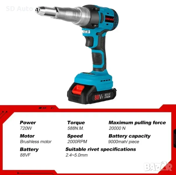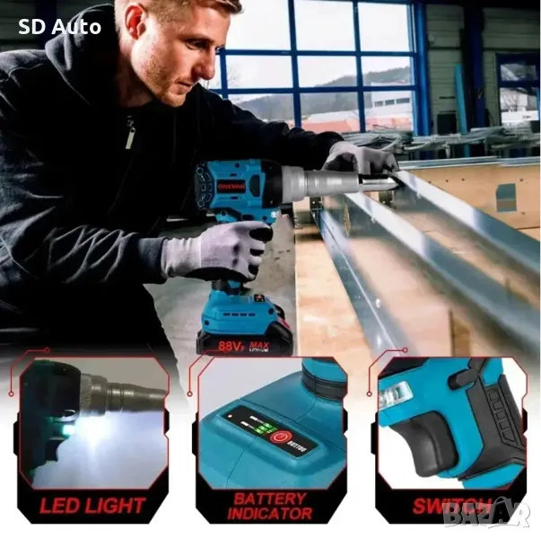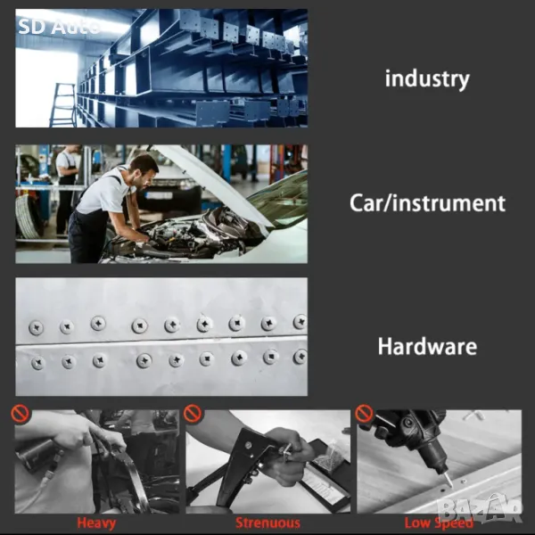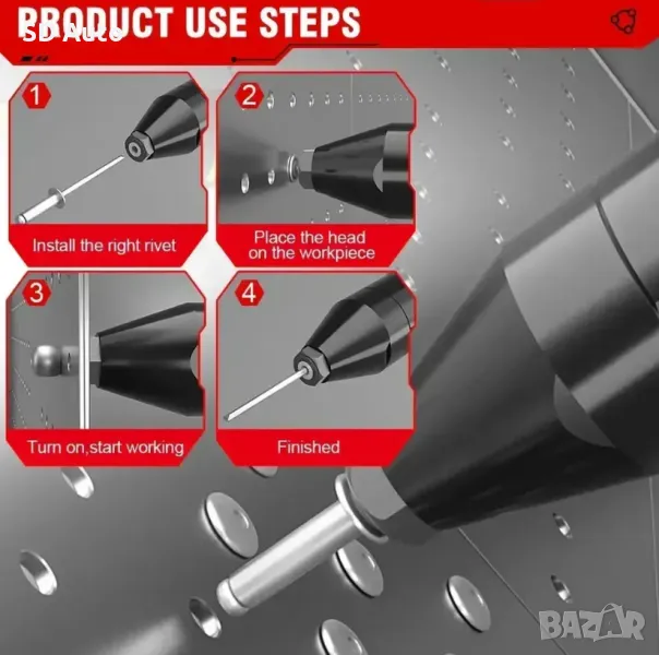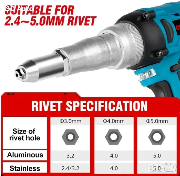 Широко използван–Пистолет за нитове може да се използва върху алуминиеви пирони; Подходящ за следните накрайници: 2,4-5,0 мм, идеален за автомобилни и строителни монтажни работи.