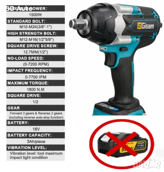 Безчетков Акумулаторен Гайковерт GISAM 1800 Nm