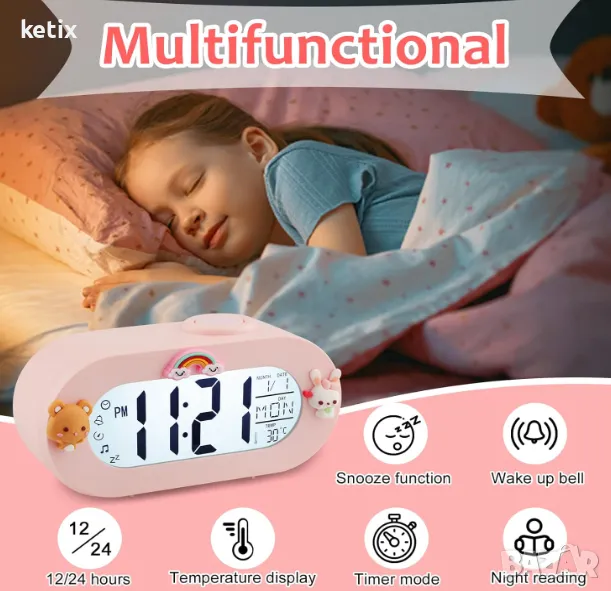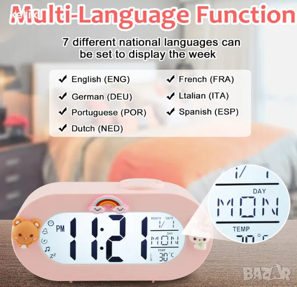 Многоезичен дисплей: Този детски будилник може да бъде настроен да показва деня от седмицата на 7 различни национални езика, което го прави лесен за използване във всяка страна: английски, немски, френски, италиански, испански, португалски и холандски. Има и 12/24 часова система и индикатор за температура