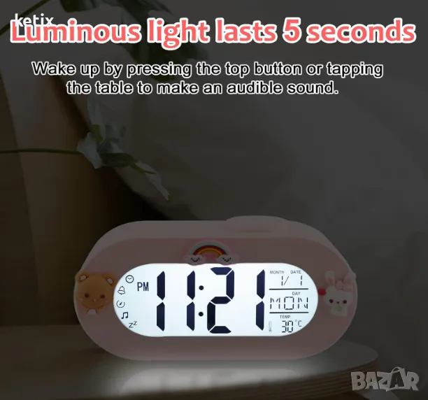 Функция за нощно осветление с гласово управление: Натиснете горния бутон, за да осветите екрана. Това улеснява децата да разчитат часа през нощта или да се събуждат, като леко докоснат масата, за да издадат звук. Детският будилник е страхотен подарък за училище за деца и страхотен инструмент за учене за ученици