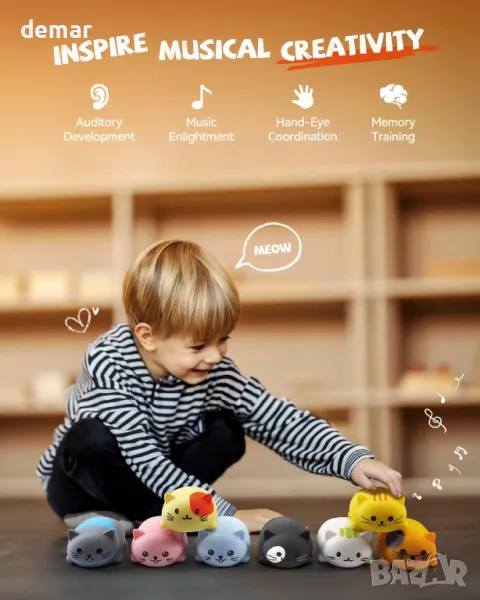 Децата могат да се насладят на създаване на музика с очарователен комплект от осем играчки за пиано във формата на котенца, включващи "MEOW" тонове, съответстващи на музикални гами за забавление и учене. Интерактивните режими позволяват на децата да свирят мелодии с единични котенца или да експериментират с акорди за креативност и развитие на слуха. Изработена от нетоксични, безопасни материали, опаковката служи и като клавиатура, добавяйки стойност към този идеален подарък за рождени дни или празници. Подходящо за всички възрасти, осигурява релаксация за възрастни и семейна връзка. Забележка: Изисква 16 AAA батерии (не са включени).