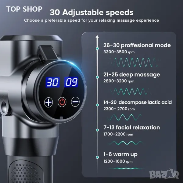 ?30 нива на интензивност и 8 масажни глави: Предлага се с 8 взаимозаменяеми масажни глави, този пистолет за мускулен масаж осигурява 1200-3500 удара в минута с регулируемо ниво на мощност от 30 интензитета, до 14 mm амплитуда и 45 паунда сила на удара. Всичко това ви позволява да регулирате скоростта и да използвате различни глави, за да имате релаксиращ масаж или ефективна терапия от врата до долната част на гърба и надолу към краката.