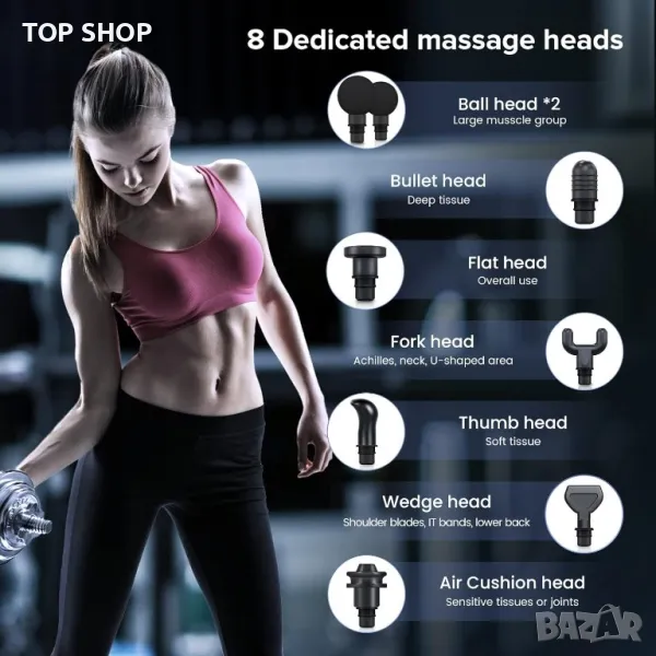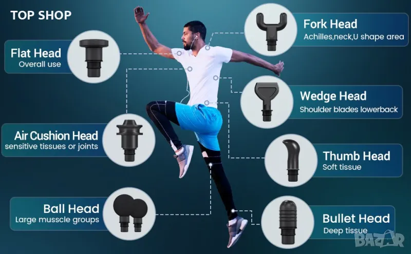 Масажният пистолет е снабден с 8 въртящи се глави, всяка от които е предназначена за определени части на тялото като врат, рамене, гръб, крак, прасец, бедра и др.
