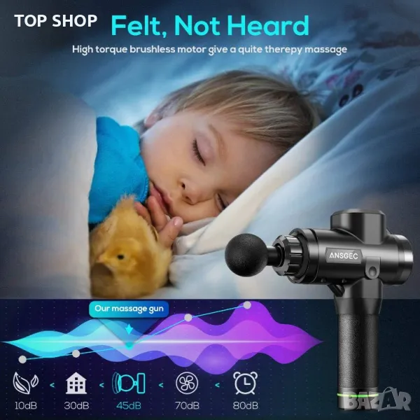 Масажният пистолет ANSGEC може да осигури поразителна дълбочина от 14 мм, което може бързо да събуди вашите дълбоки мускули. Позволява ви да влезете в състояние на упражнения и релаксация по-бързо.