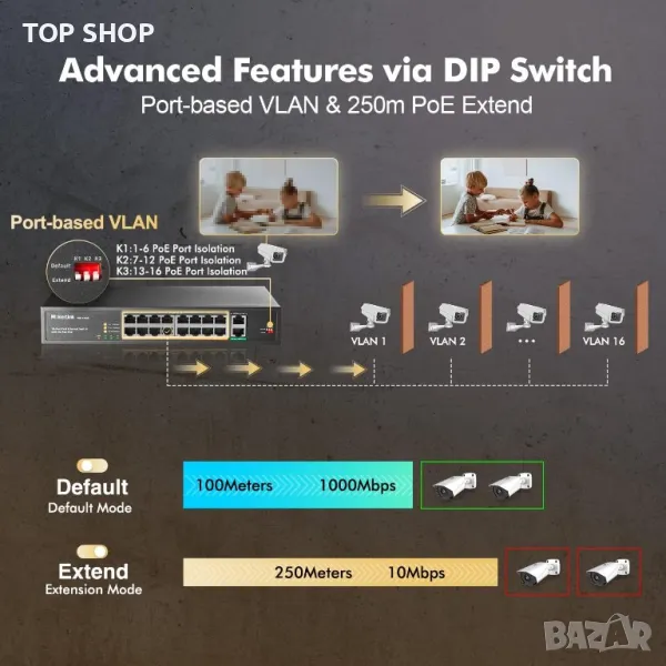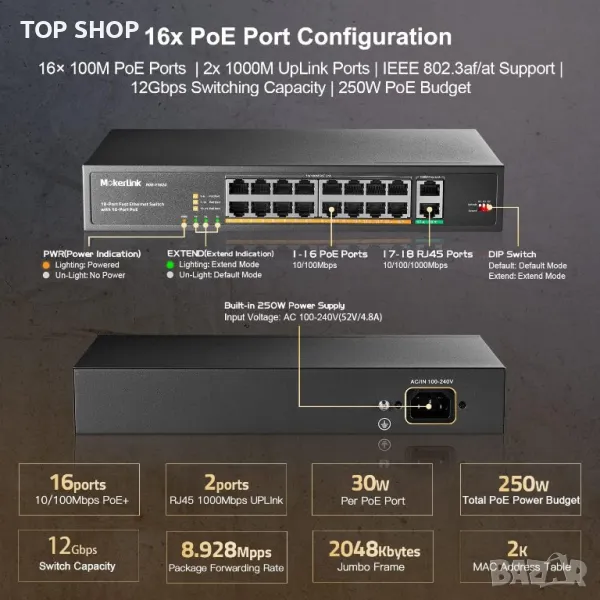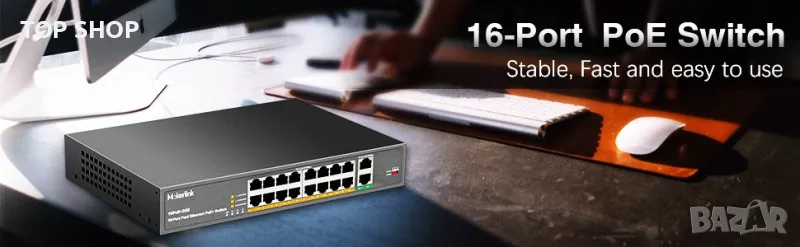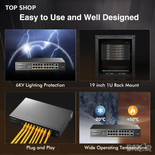 Неуправляван, Play & Play PoE превключвател. Просто трябва да свържете захранващия кабел и poe устройствата.