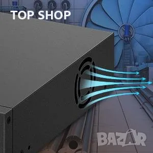 PoE превключвателят разполага с метален корпус и индустриални вентилатори, които осигуряват отлично разсейване на топлината. и по-голяма надеждност във времето.