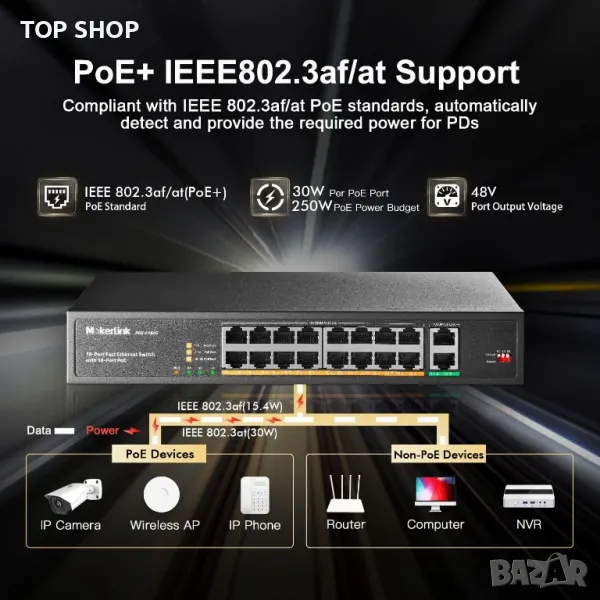 Съвместим с протокол IEEE802.3af/at, PoE превключвателят определя и доставя точното захранване на вашите устройства с изходна мощност до 30 W.
