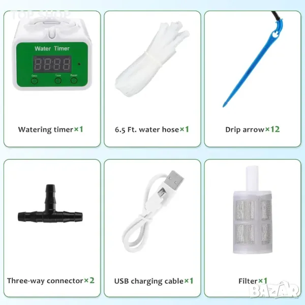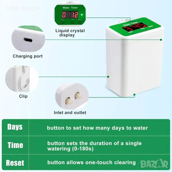 【Персонализируем таймер за поливане】: Можете да програмирате таймера, бутонът за дни може да зададе броя на дните между поливането, бутонът за време може да зададе продължителността на поливането (0-180 секунди), а бутонът за нулиране може да бъде изчистен с едно докосване, комплектите за автоматично капково напояване могат да ви помогнат да поливате навреме, да се грижите за вашите саксийни растения щателно и стриктно, решавайки проблема с грижата за растенията, когато сте в командировка или пътуване