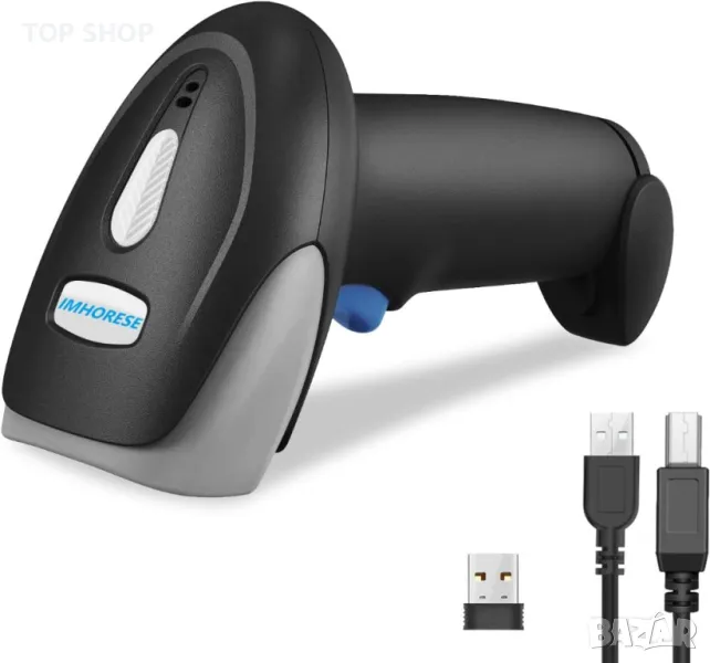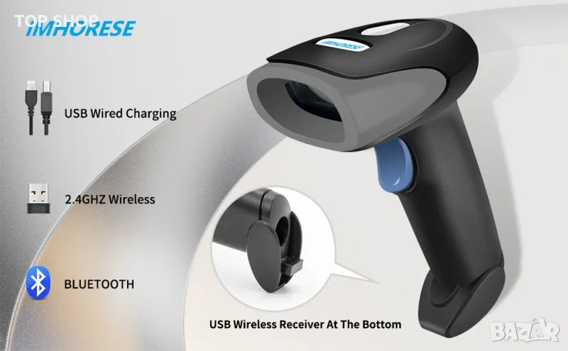 IMHORESE 8300BT Безжичен баркод скенер Bluetooth, 2D скенер за QR код, ръчен четец на баркодове PDF417 DataMatrix 2.4G безжична и USB кабелна връзка 3 в 1 Съвместим с Android, iOS, Windows, Mac