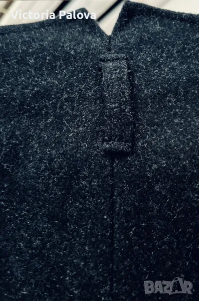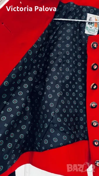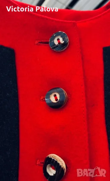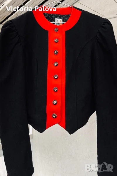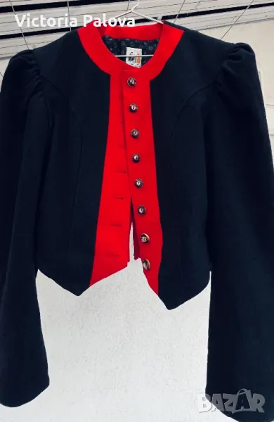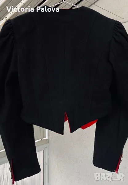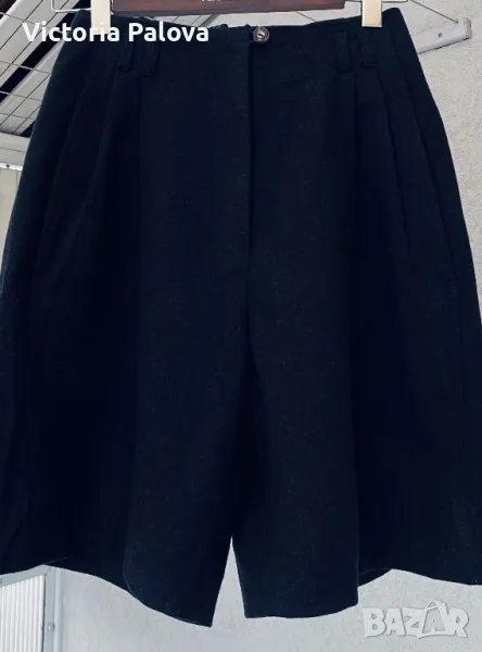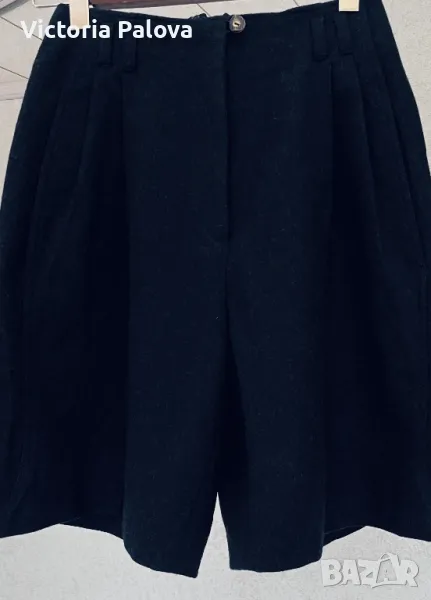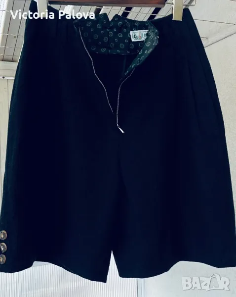 Красив комплект късо сако и панталонки ( шорти) от качествена вълна. Изглежда възхитително. Сако: рамо - 44см, ГО - 49см, дължина - 52см, ръкав - 62см. Шорти: талия - 36см, дължина - 52см, широчината на крачола горе - 36см, долу - 32см, дълбок преден цип - 24см, джобове. На крачолите отстрани, както и на ръкавите на сакото - по три красиви копчета ръчна изработка.