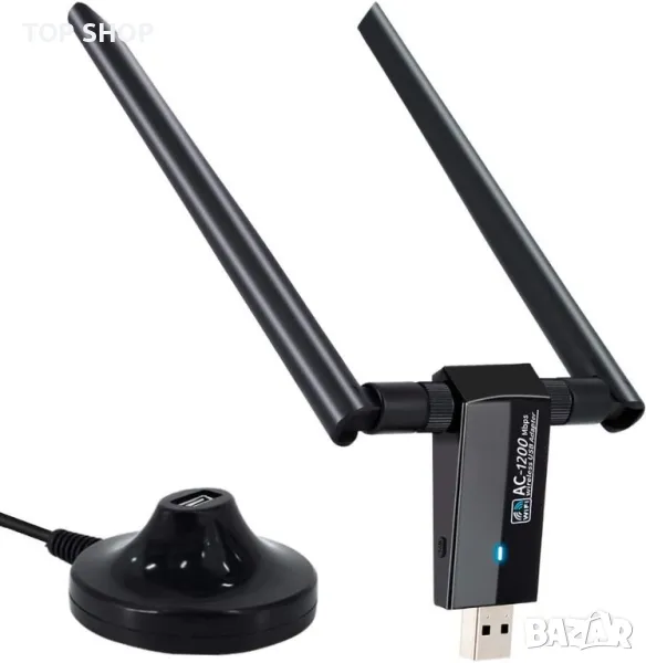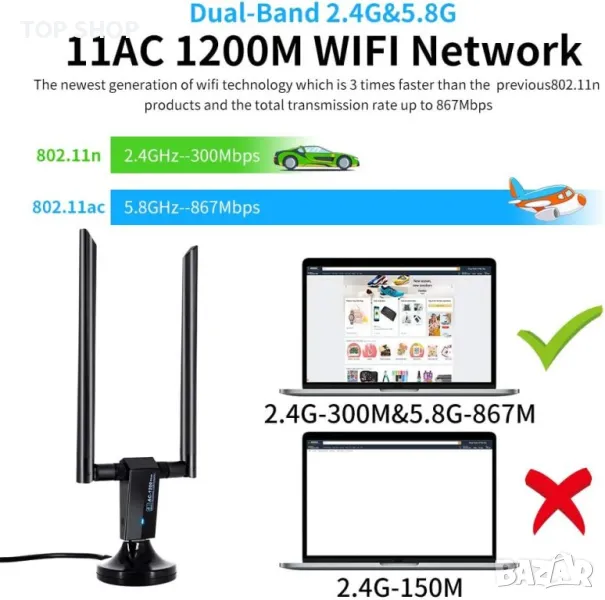 Висока скорост: Безжичен USB WiFi адаптер до AC 1200 Mbps на 5,8 GHz (867 Mbps) или 2,4 GHz (300 Mbps), двойна лента, по-добра връзка с WiFi рутер и изживяване при гледане на видеоклипове онлайн или игра на игри.