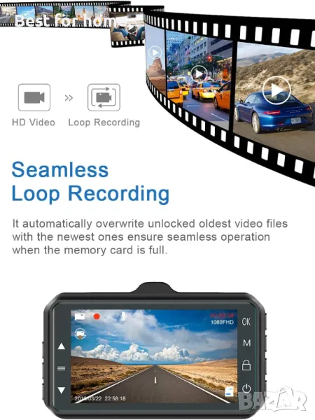 Тази камера за кола може да записва непрекъснато видео, безпроблемният цикличен запис създава видеоклипове с малко видео с дължина, която се определя от избраните 1/3/5 минути. Най-старите отключени видеоклипове ще бъдат заменени от най-новите видеоклипове, когато картата с памет е пълна. Безкрайният цикъл на запис ще ви позволи никога да не пропуснете нито един момент.