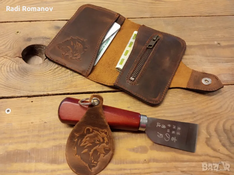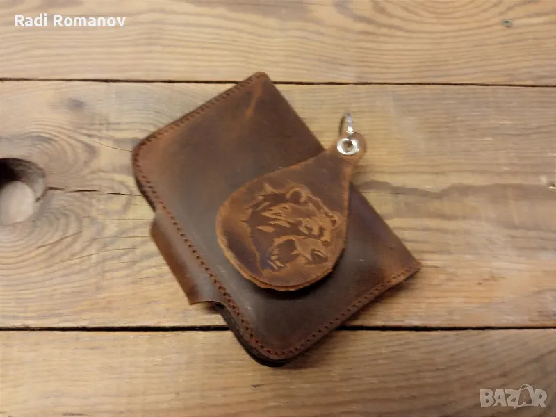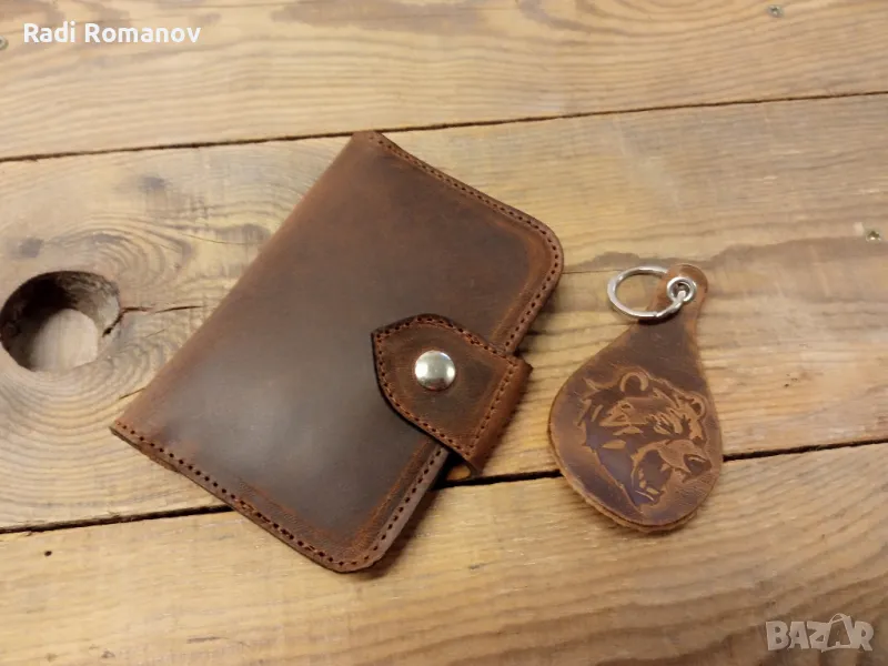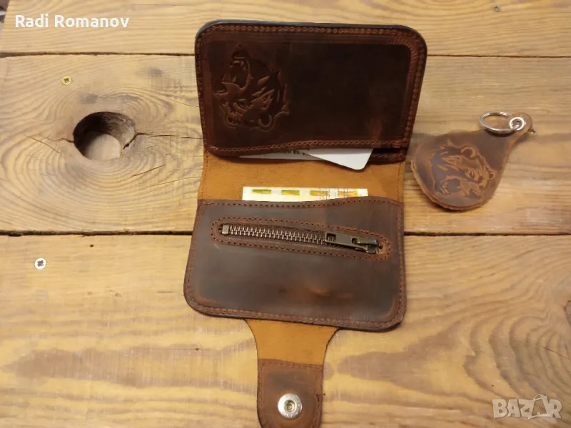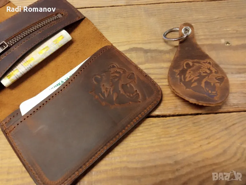 Този елегантен мъжки кожен комплект е изработен ръчно от висококачествена естествена кожа в наситен кафяв цвят. Комплектът включва портфейл с уникален дизайн, съдържащ четири отделения – едното с цип за малко монети, а другите за банкноти или карти, ловни, риболовни документи . Външната част на портфейла е украсена с прецизно гравиран образ на мечка, символ на сила и увереност. Освен портфейла, комплектът включва и стилен кожен ключодържател с подобен мотив на мечка, което добавя завършен вид на аксесоара. Издръжливата кожа и детайлната изработка го правят идеален избор за ежедневно ползване или подарък за специален повод