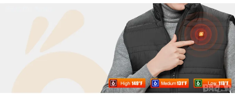 ВСИЧКА ТОПЛИНА: Отопляемата жилетка UNBON за мъже е жени разполага с 6 нагревателни елемента от въглеродни влакна, които генерират нежна равномерна топлина в основните области на тялото (яка, горна част на гърба, кръста, както и ляв и десен бюст), поддържат тялото и ръцете ви топли и уютни . 3 налични настройки за отопление (висока 149°F, средна 131°F, ниска 113°F) могат да се регулират само с едно натискане на бутона, за да персонализирате своя комфорт. Останете красиви, препечени и удобни в мразовито време с нашата мъжка жилетка с подгряване UNBON.