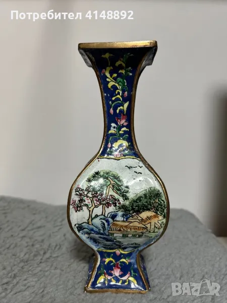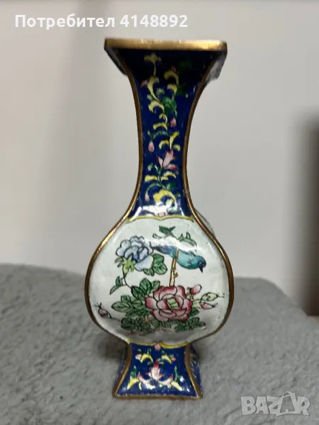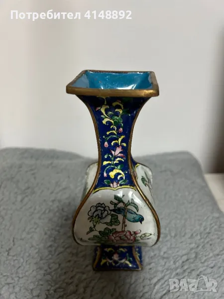 Продавам китайска старинна ваза с емайлиран бронз. Ръчна изработка декорирана с цветен клетъчен емайл Клоазоне – Cloisonne с много красиви цветове,богати нюанси и ослепителен блясък. Височина 20см. За гр. София може и лично предаване.