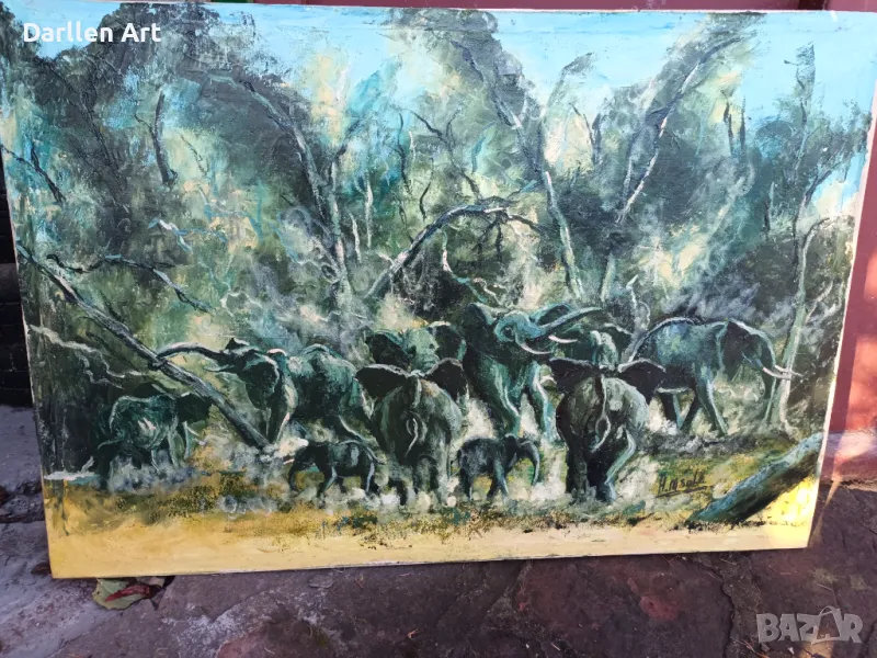 Стадо диви слонове, маслени бои върху платно, размери 61/91 без рамка, автор Хенри Мсоле - английски художник с танзанийски произход, подписана, автентична, лично закупена от автора през 1983 г., идеално съхранена, без забележки.