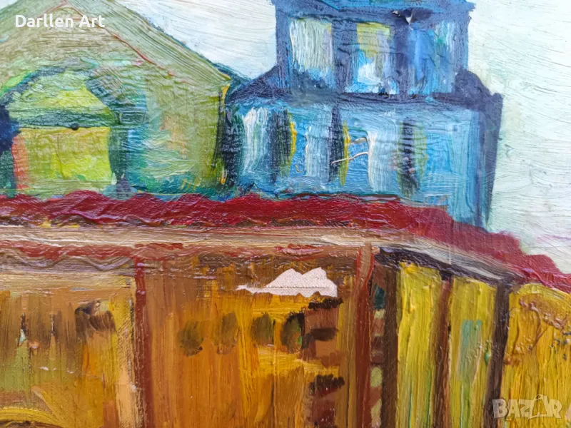 Стара авторска картина, градски пейзаж, маслени бои върху платно, размери 57/83 без рамка, неподписана, нерамкирана, автентична, 2 забележки, показани на снимките - малко петно с олющена боя и почти незалежимо леко скъсано платно, което е поправимо.