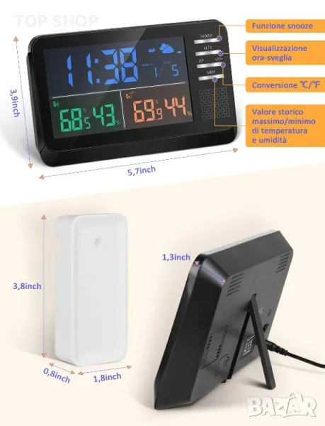 Мултифункционална метеорологична станция: метеорологичната станция има множество функции, за да отговори на различни нужди: вътрешна и външна температура и влажност, показване на максимална/минимална температура и аларма, прогноза за времето, време (12/24 часа), календар, седмица, ежедневен будилник и функция за дрямка, можете да видите цялата необходима информация на LCD екрана в цвят