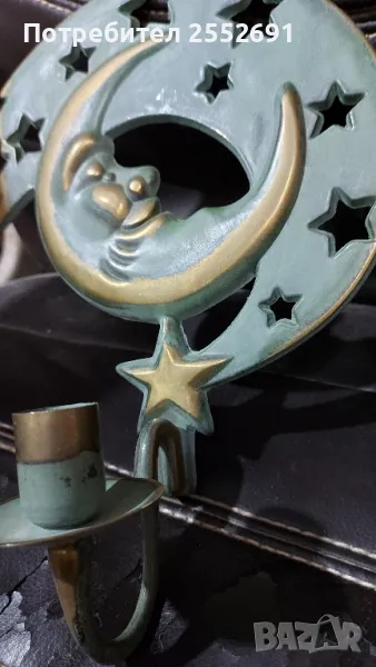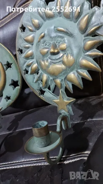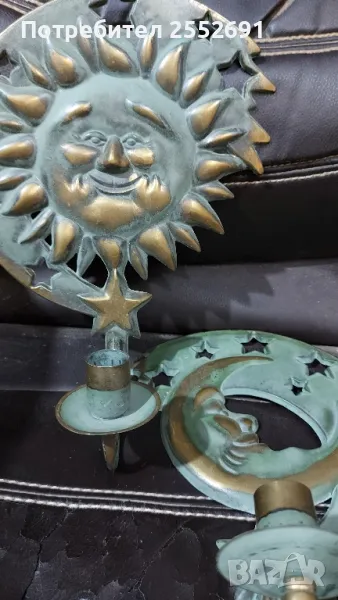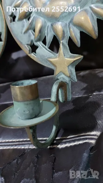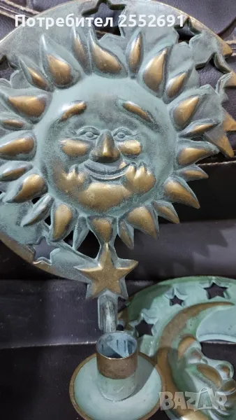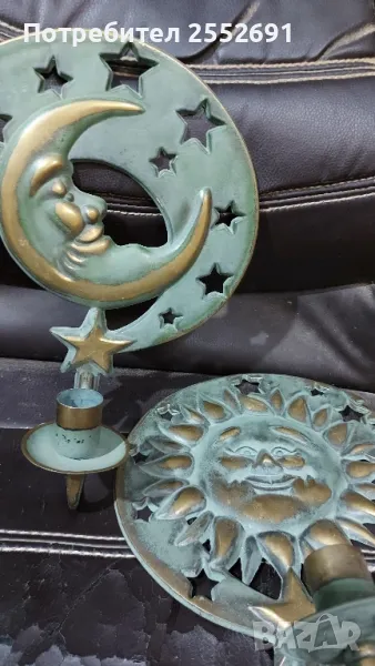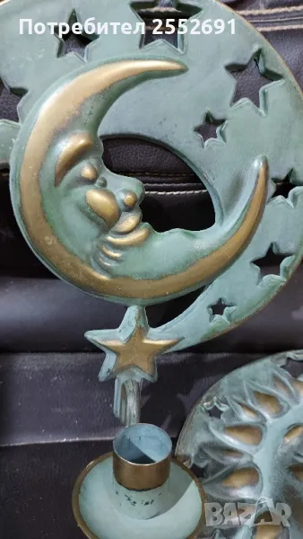 Комплект от 2 броя стенни "небесни" свещници- СЛЪНЦЕ И ЛУНА с месингова зелена патина. Наличие на фирмен надпис- 1994 "PARTYLITE"