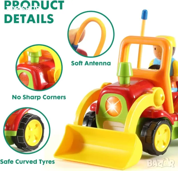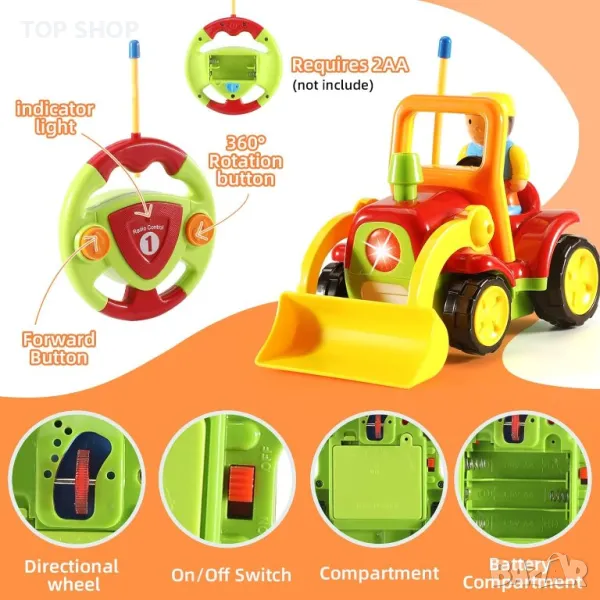 Сладката и стилна R/C кола е подходяща за деца на възраст над 3 години. С цветен и прекрасен външен вид, тази детска кола с дистанционно управление ще бъде любимата на децата. Тази анимационна радиоуправляема кола с музика, звук и светлина може да стимулира безкрайното въображение на бебето. Натиснете бутоните, тази детска количка ще издаде свирки на влака или сладка музика. Вълнуващи светлини ще мигат със звуците. Водачът може да бъде отделен от седалката, добавя повече забавление за игра. Дистанционното управление на тази играчка за малко дете има само 2 бутона: напред и назад. Лесен е за работа от всички деца на различна възраст. Тази бебешка кола с дистанционно управление се нуждае от 3 AA батерии (не са включени), дистанционното управление се нуждае от 2 AA батерии (не са включени). Тази анимационна радиоуправляема кола за малки деца е изработена от висококачествен ABS материал, нетоксичен и без мирис. Колата е гладка и ръбовете са кръгли, отговаря на стандартите за играчки на 100%. Чудесно за деца като първа играчка с дистанционно управление. Тази кола има 2 звука. Натиснете бутона отпред на машиниста, колата ще издаде звуци от свирка на влак. Натиснете машиниста, колата ще направи сладка музика. Има голяма светлина в горната част, която ще мига със звуците. Въпреки че светлината е голяма, но топлият й цвят не наранява очите. Предлага се с дистанционно радио управление. Има само 2 бутона за управление на движение напред, назад или обръщане. Много е лесно за малки деца или начинаещи. Изработена от висококачествен ABS материал, тази играчка е безопасна, здрава и устойчива на износване. Гладката повърхност на тази играчка е безопасна за игра от деца.