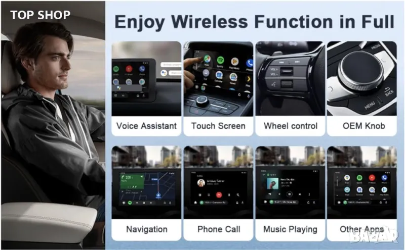 БЕЗЖИЧЕН АДАПТЕР ЗА АВТОМОБИЛ ЗА ANDROID AUTO: Силата на вашия телефон върху екрана на вашия автомобил - Android Auto е по-лесен и по-безопасен начин да използвате телефона си в колата. Нашият безжичен адаптер за android auto се свързва с Android Auto на дисплея на вашия автомобил.