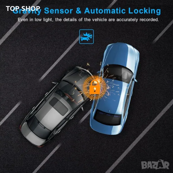 【Сензор за гравитация и автоматично заключване】 - Нашето видеорегистратор е вградено във високоефективен G-сензор, който автоматично записва спешни случаи и записва видеоклипове. Когато превозно средство се сблъска, видеорегистраторът автоматично записва и заключва важните кадри, които се записват в момента като доказателство. Освен това натиснете бутона за заключване, за да заключите ръчно текущия видеоклип, така че дори и да няма удар, но видите нещо интересно/важно на пътя, можете да заключите записа.