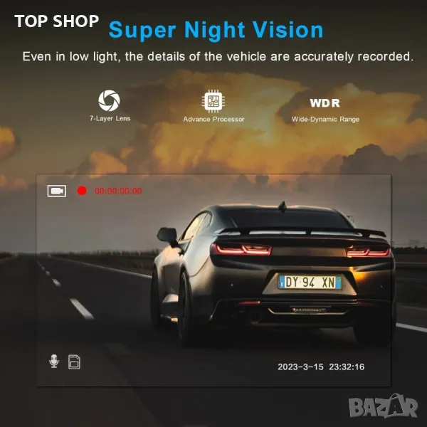 WDR алгоритъмът автоматично настройва оптималния баланс на експозицията, няма повече досадно преекспониране и недостатъчно експониране. Вградената голяма бленда абсорбира повече светлина и осветява тъмните сцени. Нашият рекордер за кола може да се представи по-добре по отношение на точността и яснотата на цветовете, като улавя пътните условия през нощта по-ясно.