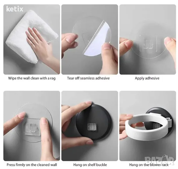 Лесен за инсталиране: държачът за сешоар се монтира много лесно. Няма нужда от пробиване и има здрава вендуза на гърба, която е много удобна за поставяне. Сешоарът е подходящ за стъкло, плочки, стени, врати за баня, кухня и други гладки стени.