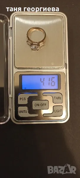 пръстена е е тип годежен с голям цирконий и шест по-малки,по три от всяка страна,снимани са печатите.цена-25 лв.