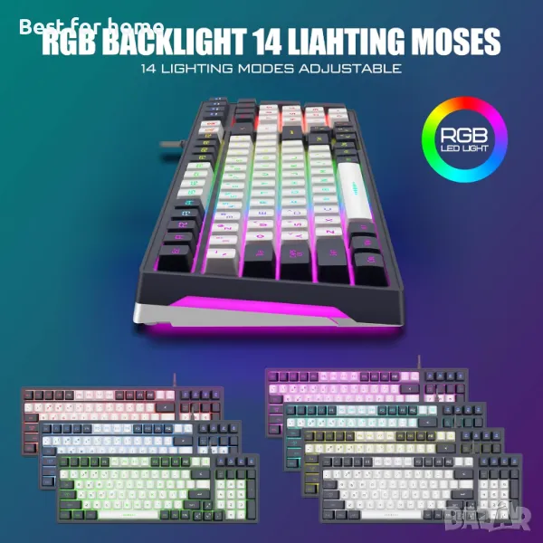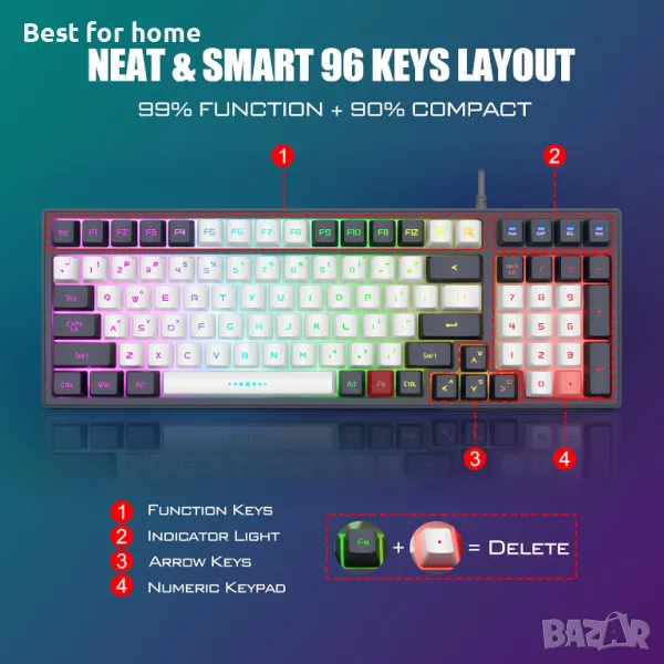 【Компактно оформление】 K96 е RGB клавиатура за игри. Оформлението с 96 клавиша несъмнено е най-добрият избор за играчи, които се нуждаят от усещане за пространство и обичат да използват цифрова клавиатура. Пропуснатите функционални клавиши осигуряват много място за движение на мишката. FPS геймърите не трябва да пропускат тази клавиатура.