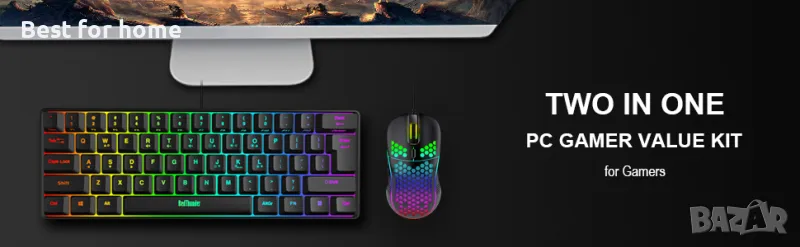 60% комбинация от клавиатура и мишка за игри, ултракомпактна миниклавиатура с RGB подсветка с 61 клавиша, лека 7200 DPI оптична пчелна пита, комплект за игри с кабел за PC MAC PS5 Xbox Gamer (черен)