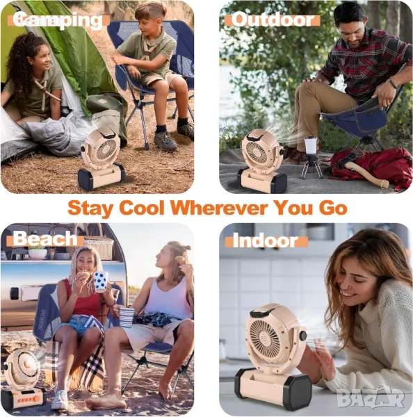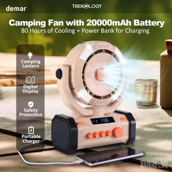 Вентилатор за къмпинг TREKOLOGY с 20000mAh батерия и Power Bank, 120° осцилация, LED светлина