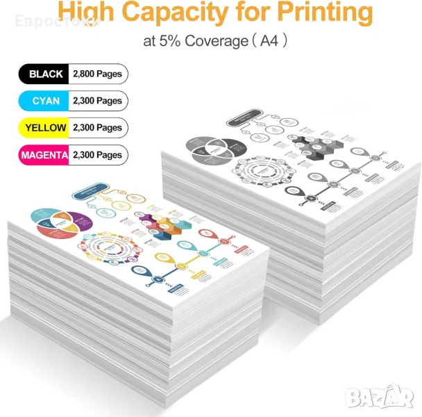 2800 страници на черна касета, 2300 страници на цветна касета (A4 с 5% покритие, ISO/IEC 19752)