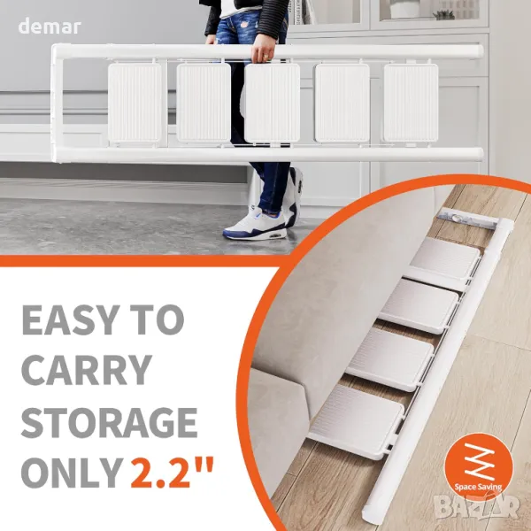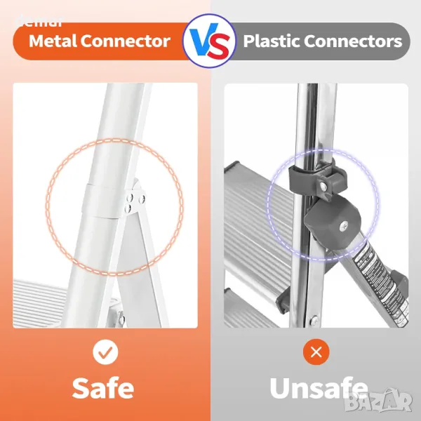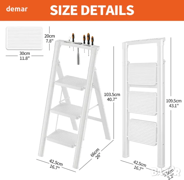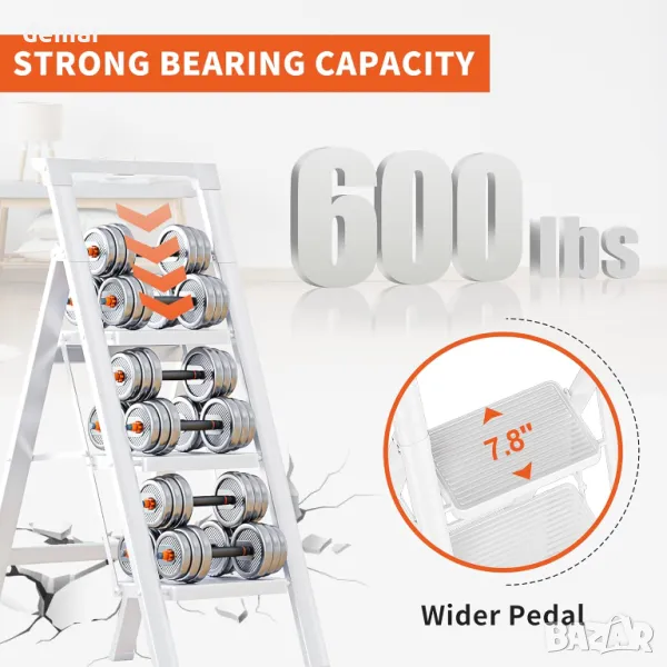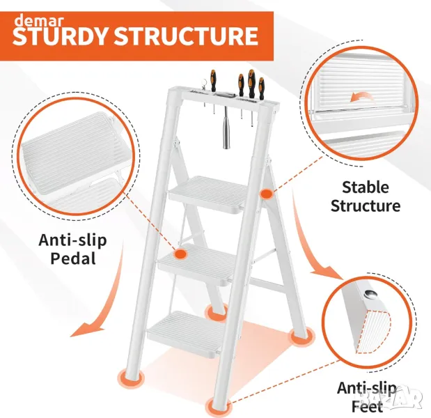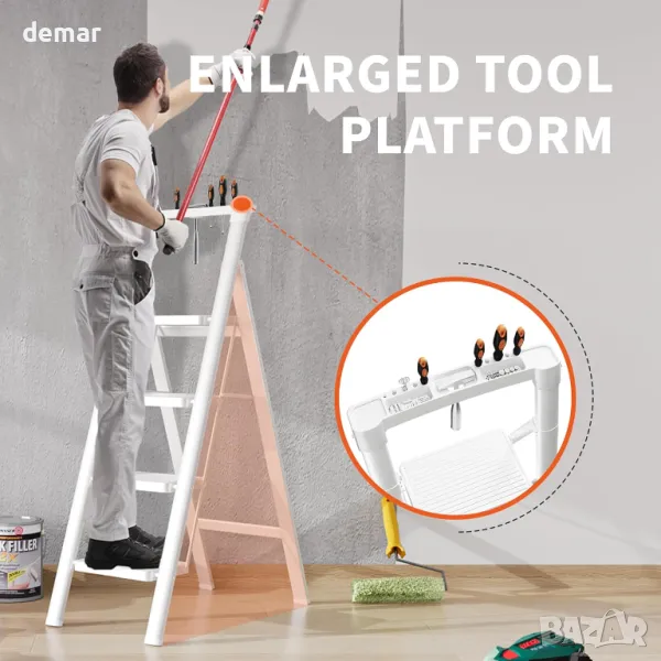 Тази стълба съчетава гъвкавост и удобство със здрава конструкция от въглеродна стомана, издържаща до 270 кг. Разполага с широки, противоплъзгащи се стъпала с 22 см разстояние за комфорт и подложки под ъгъл за крака за стабилност върху неравни повърхности. Лесно преносим и лек, той се сгъва само до 5 см за компактно съхранение. В допълнение, той служи за множество цели, като столче, платформа за домашни любимци или кашпа, с голяма платформа за инструменти за допълнителна функционалност.