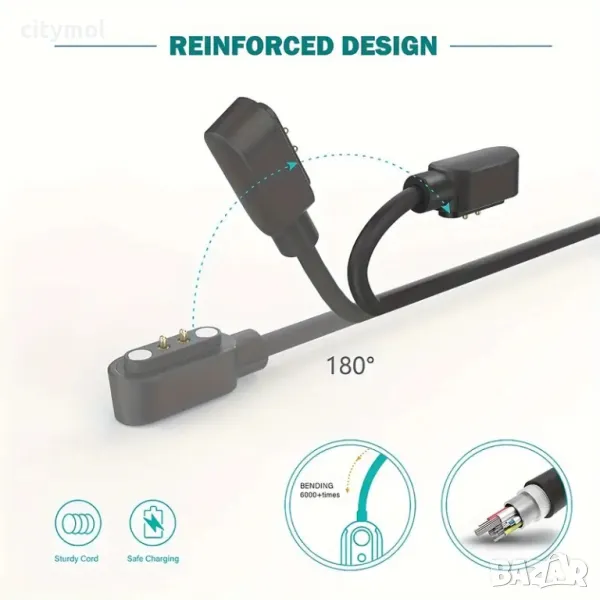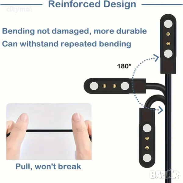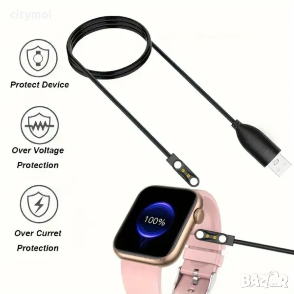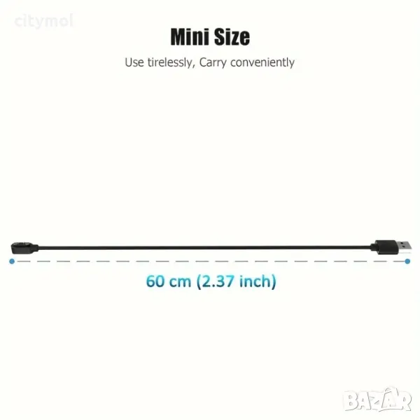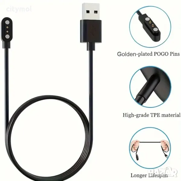 USB магнитно зарядно, съвместимо с двупинови смарт часовници и гривни с разстояние между пиновете 2,4 мм.