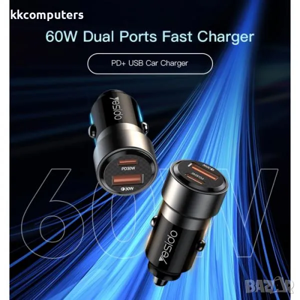 12V Зарядно за автомобил Yesido Y54 / USB 30W , PD 30W / с кабел Type-C - Lightning / Черен / Баркод → Обява 48490539
