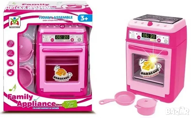 Детската играчка представлява печка с отваряща се вратичка и аксесоари за готвене.