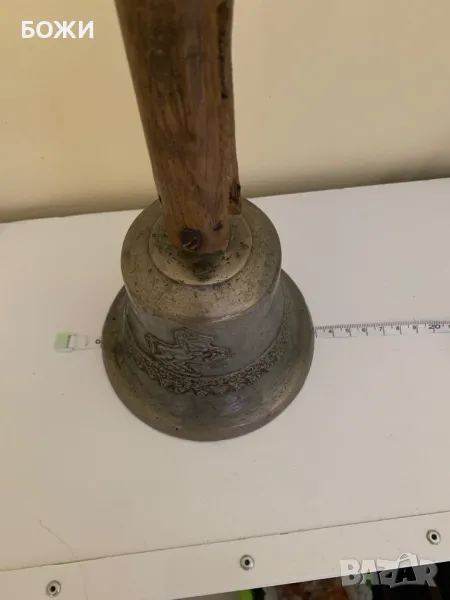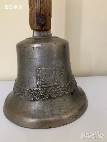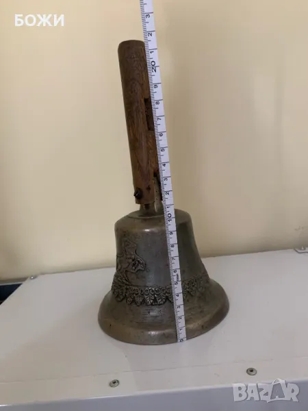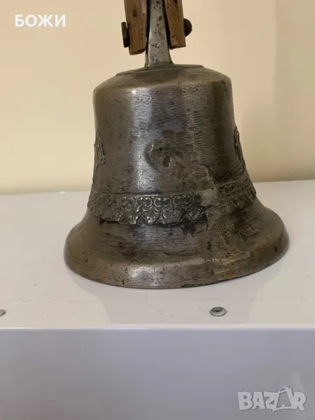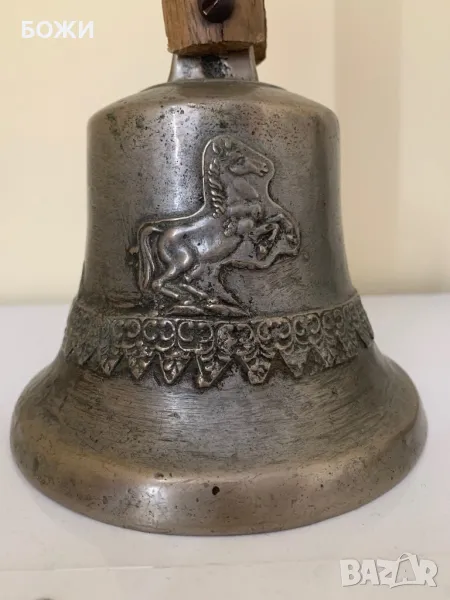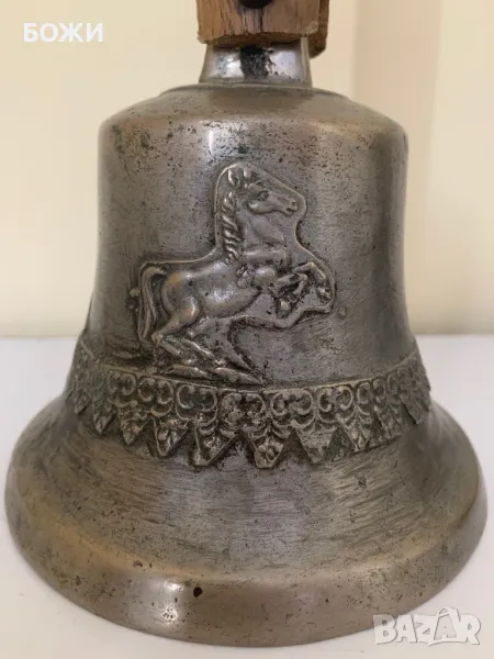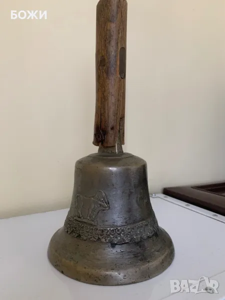 Продавам автентична стара училищна камбана, изработена от масивен бронз с красиви релефни орнаменти, включително изображение на конник. Камбаната има ясен, мощен звук и носи духа на миналото. Дръжката е от плътно дърво, с естествена патина от годините, което ѝ придава още повече характер.