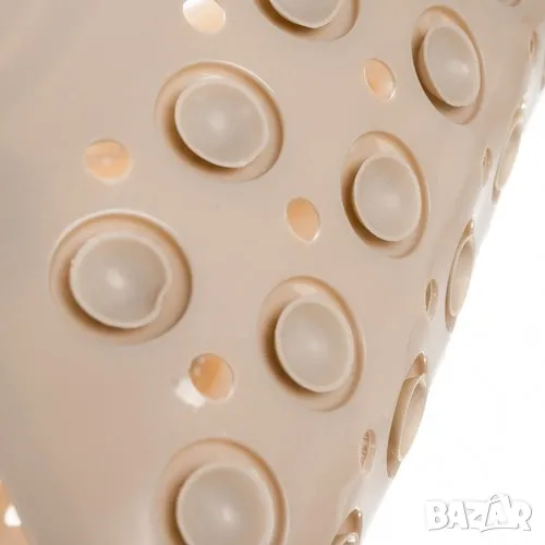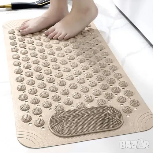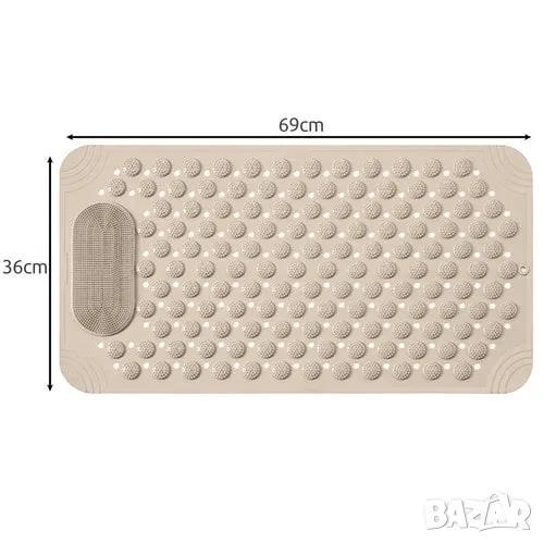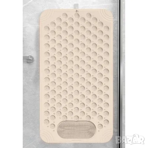 Масажната постелка за баня съчетава безопасност и комфорт, подходяща както за ваната, така и за душ кабината. Тя осигурява стабилност благодарение на вендузите против подхлъзване, а специалните масажиращи шипове стимулират кръвообращението и предлагат релаксация. Постелката е водоустойчива, с отвори за оттичане на водата, които предотвратяват мухъл и ускоряват съхненето. Лесна е за почистване и поддръжка – изплакнете я или я избършете. Дизайнът ѝ включва отвор за закачане, което улеснява съхранението и пести пространство. Протуберансите на повърхността ѝ позволяват удобно измиване на краката без навеждане.