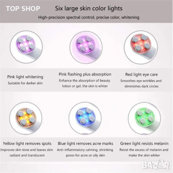 Универсален: оборудване за красота, 6 цвята светлинен режим, избелване против стареене, изглаждане на бръчки, тъмни кръгове и фини линии. Подходящ за очи, лице, шия и тяло.