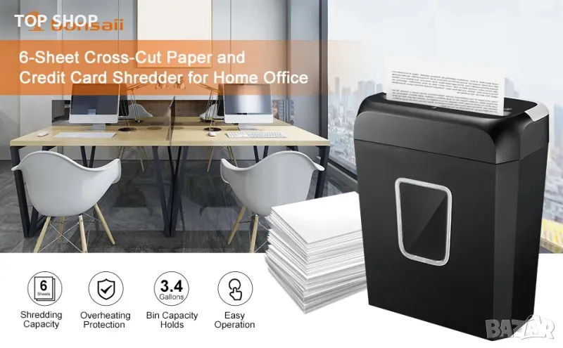 【Унищожител за хартия и кредитни карти】 Домашен шредер за хартия Bonsaii, раздробява до 6 листа хартия наведнъж (максимум 36 листа за една минута) на малки парчета с размери 13/64 x 45/64 инча (5x18 mm), също унищожава документи /телбод/кредитни карти/нежелана поща без пластмасово фолио и др.