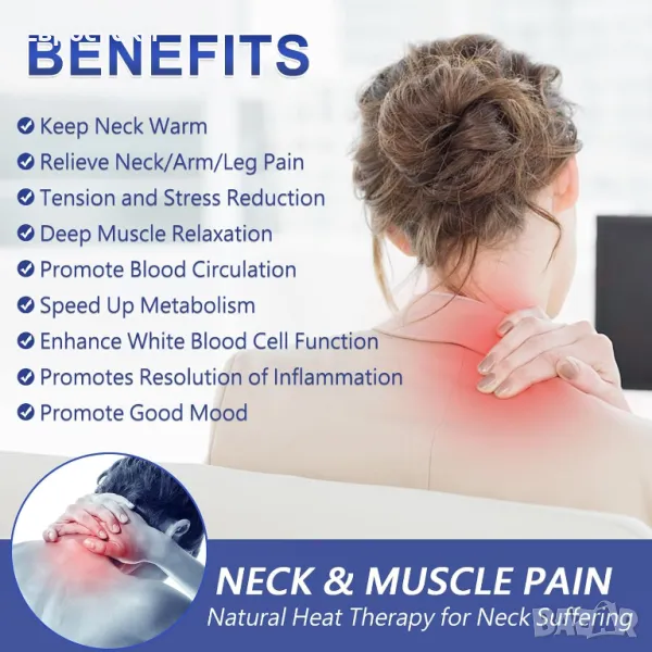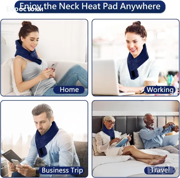 Нагревателната подложка JOBYNA за врата е снабдена със захранващ кабел от 2,6 метра, достатъчно е дълъг за използване в офиса, у дома, както и по време на пътуване. Където и да сте, той може да осигури топлинна терапия за болезненост и скованост на врата, облекчаване на скованост на мускулите, болки във врата, мигрена, мускулно напрежение, цервикална спондилоза, навяхвания, мускулни крампи, нервно напрежение, релаксация преди йога и т.н.